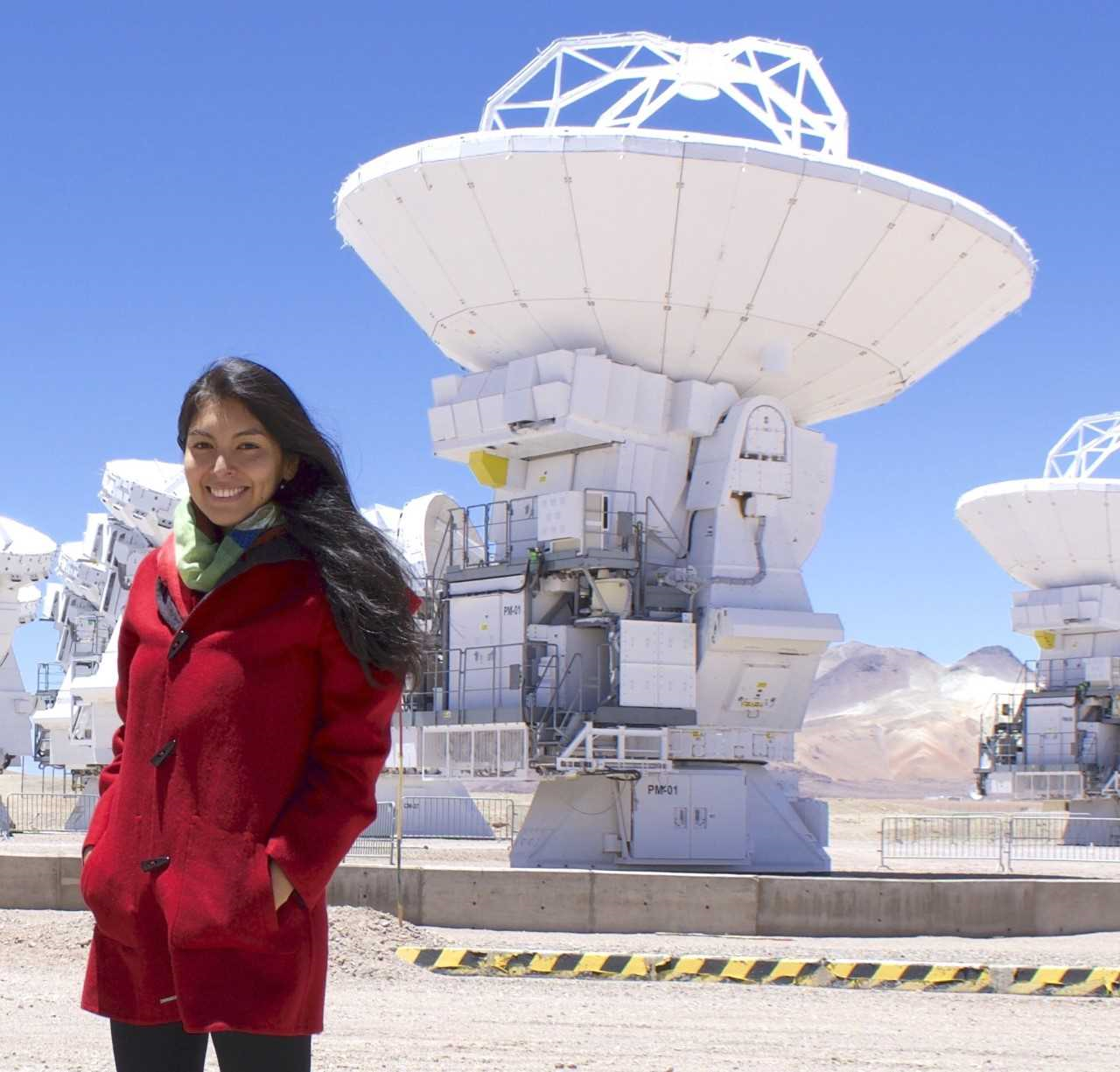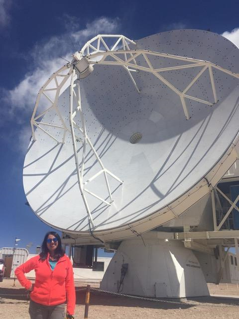 Paulina in front of the APEX telescope on the Chajnantor Plateau, deep in the Atacama Desert.