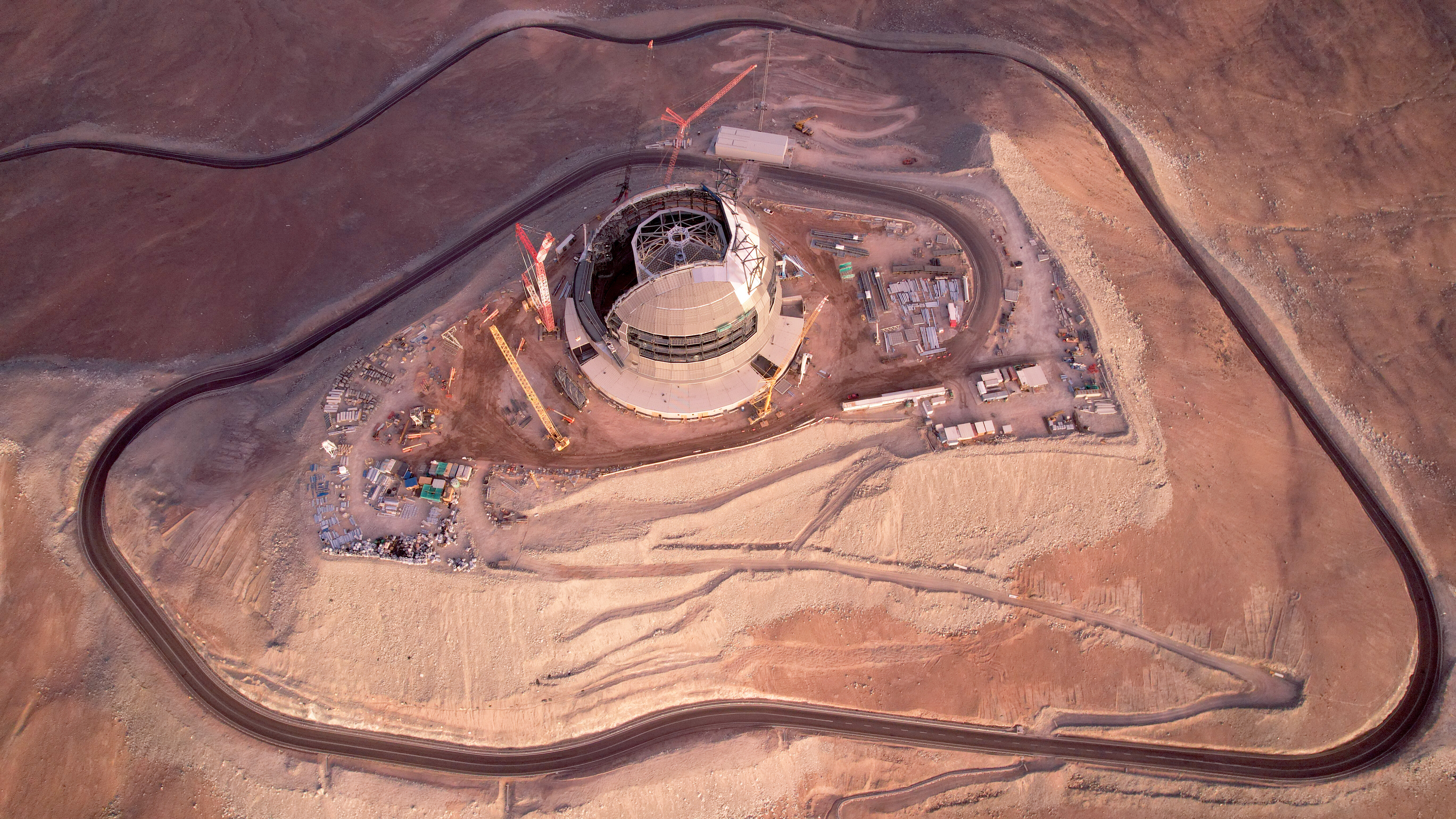 It's a long way to the top of Cerro Armazones, where ESO's Extremely Large Telescope (ELT) is steadily rising. In this drone shot from January 2025, the telescope might look small, but its rotating enclosure actually extends about 80 meters from the ground and measures 93 metres in diameter. The main structure of the telescope, which will hold its five mirrors, is clearly visible inside the dome. The ELT's primary mirror alone will have a diameter of 39 metres.