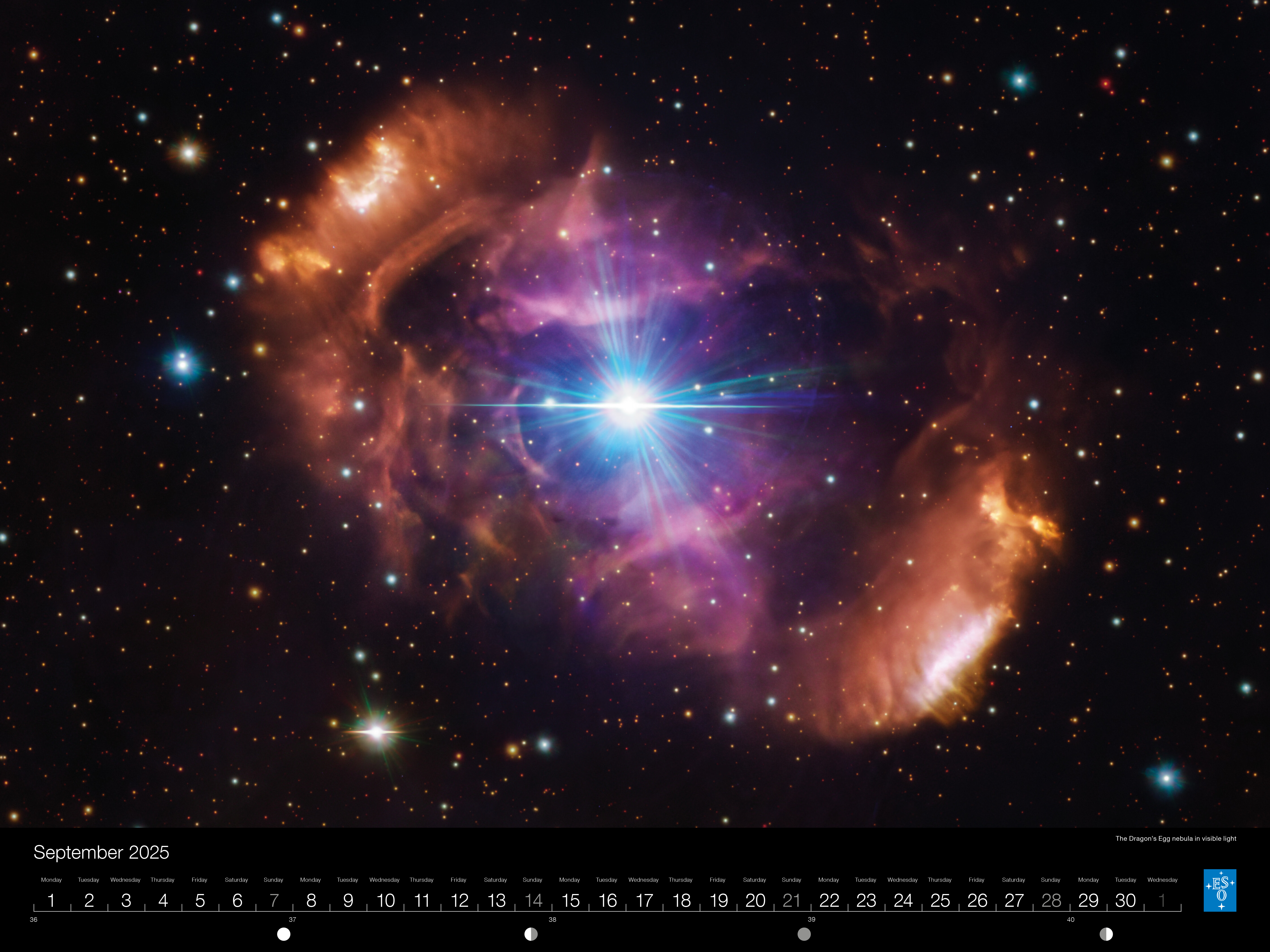 This image, taken with the VLT Survey Telescope hosted at ESO’s Paranal Observatory, shows the beautiful nebula NGC 6164/6165, also known as the Dragon’s Egg. The nebula is a cloud of gas and dust surrounding a pair of stars called HD 148937.