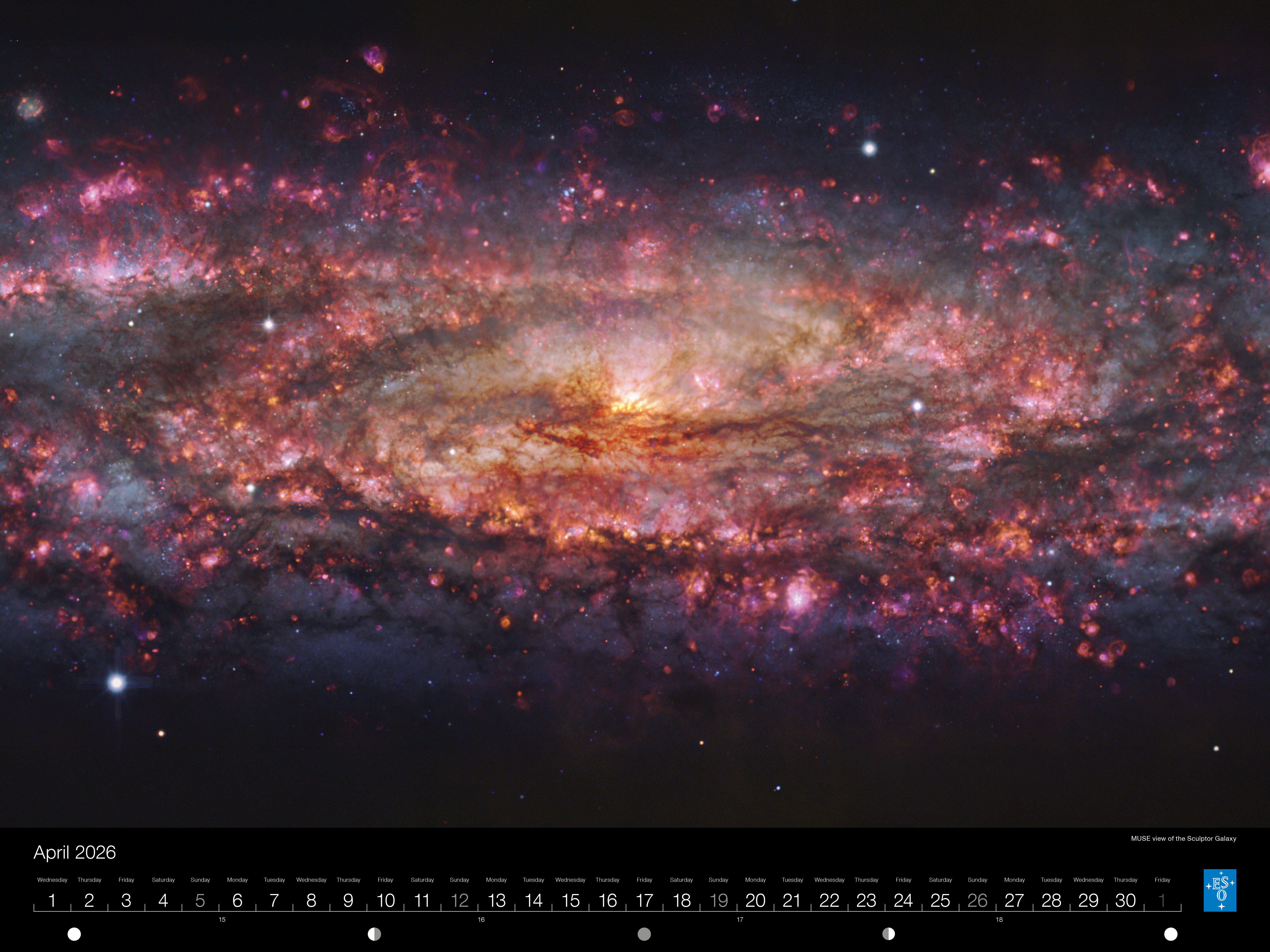 This image shows a detailed, thousand-colour image of the Sculptor Galaxy captured with the MUSE instrument at ESO’s Very Large Telescope (VLT). Regions of pink light are spread throughout this whole galactic snapshot, which come from ionised hydrogen in star-forming regions. These areas have been overlaid on a map of already formed stars in Sculptor to create the mix of pinks and blues seen here.