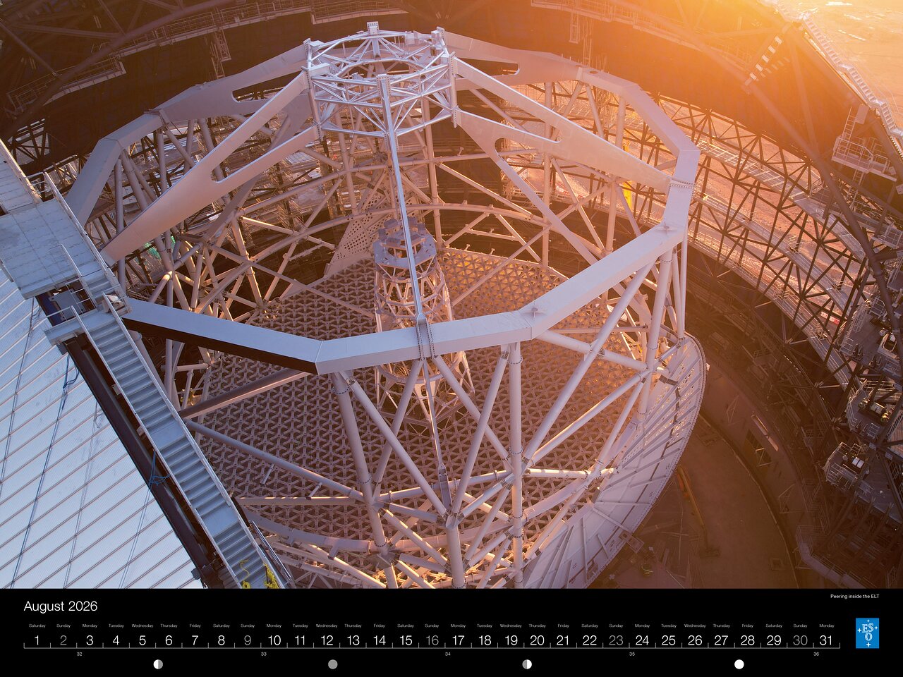 From up here, the ELT’s white tube-like altitude structure is clearly the eyecatcher. The close-knitted truss structure at the bottom is the support cell of the ELT’s 39-m primary mirror, the largest telescope mirror ever made. The light it collects from the cosmos will bounce off to the secondary mirror, which will be held in the central ring seen at the very top of the picture. Light will then travel down again through the ELT’s central tower and its three additional mirrors, before it reaches the scientific instruments that will be located at the side of the telescope.