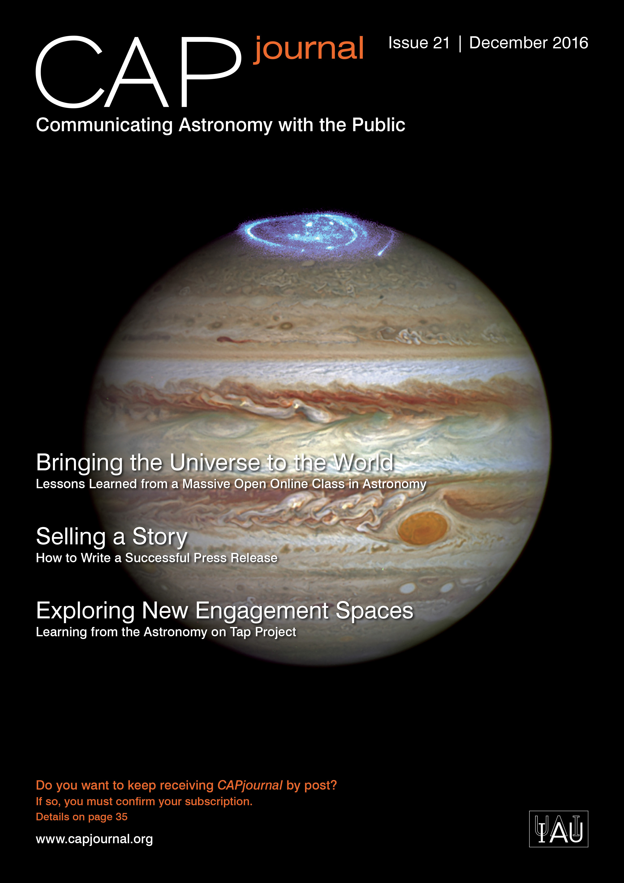 In this issue our contributors outline a summer programme in astronomy for high-school students; evaluate a massive open online class in astronomy; provide essential tips on how to write a successful press release; and describe astronomy communication at its most informal — a growing programme of astronomy events held in bars.