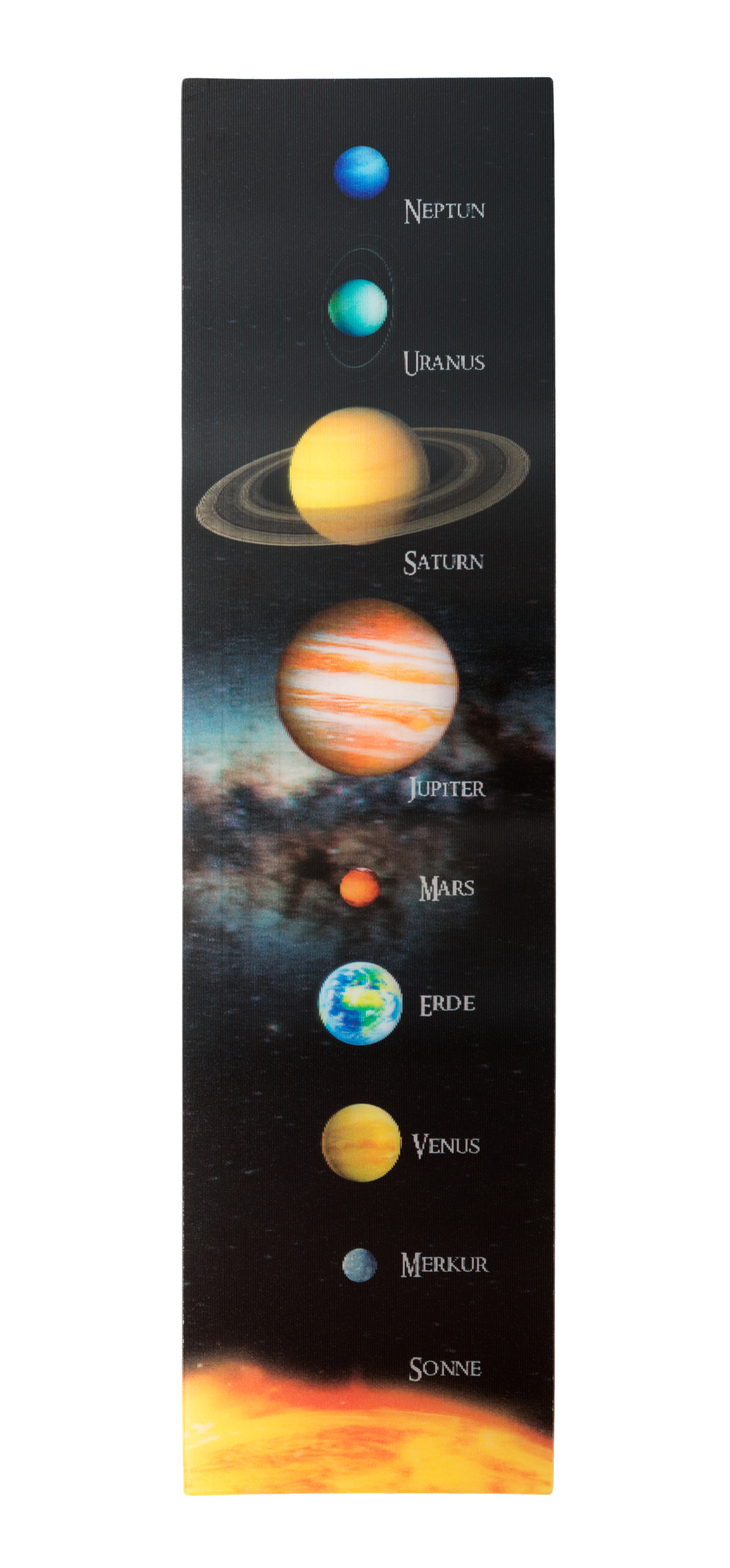Keep this beautiful Solar System bookmark nestled in the pages of your favourite book, so you can always pick up where you left off and never lose your place. This bookmark is in German.