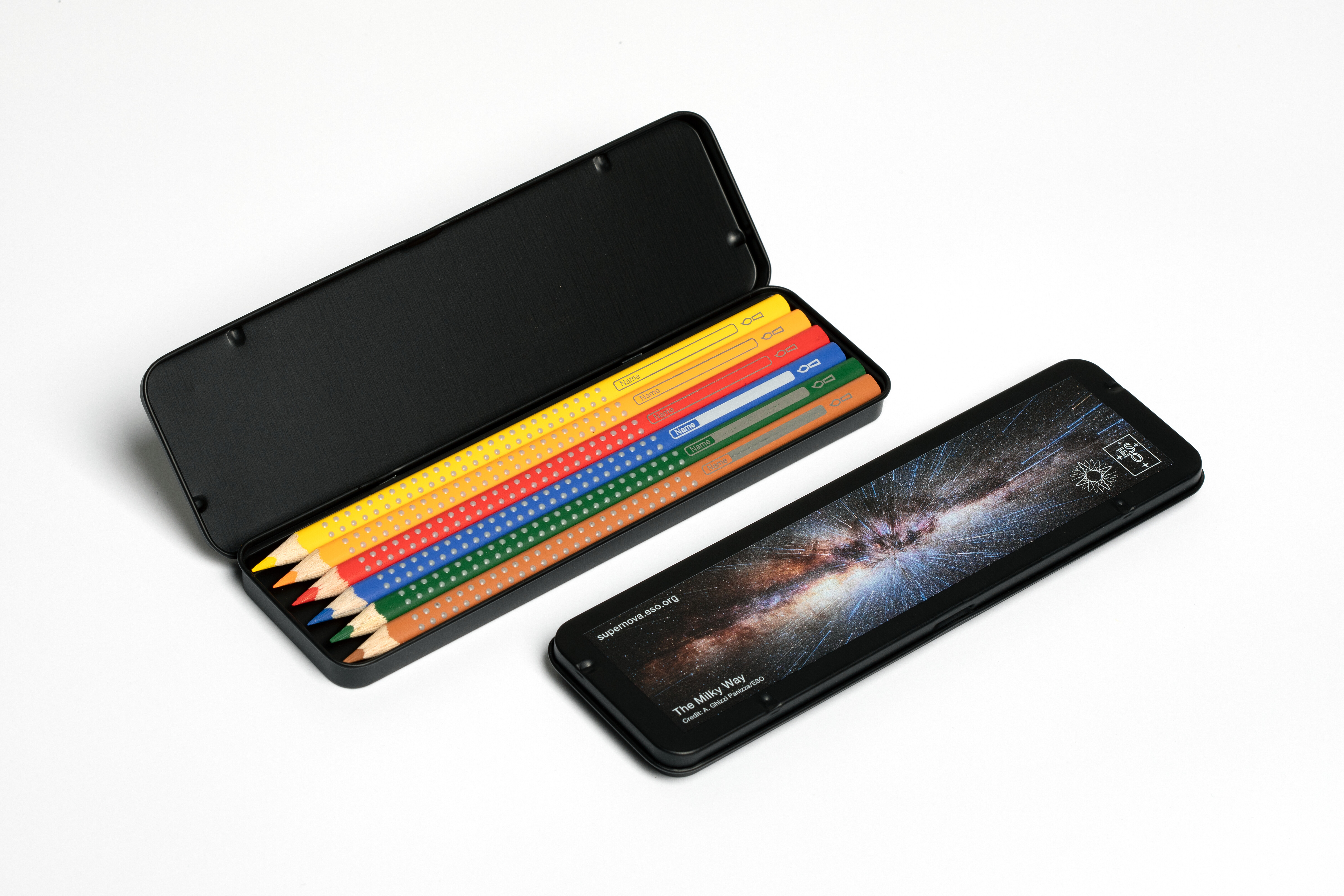 Set of 6 Faber Castell colouring pencils inside a metal case, with an eye-catching astronomical image on the lid.