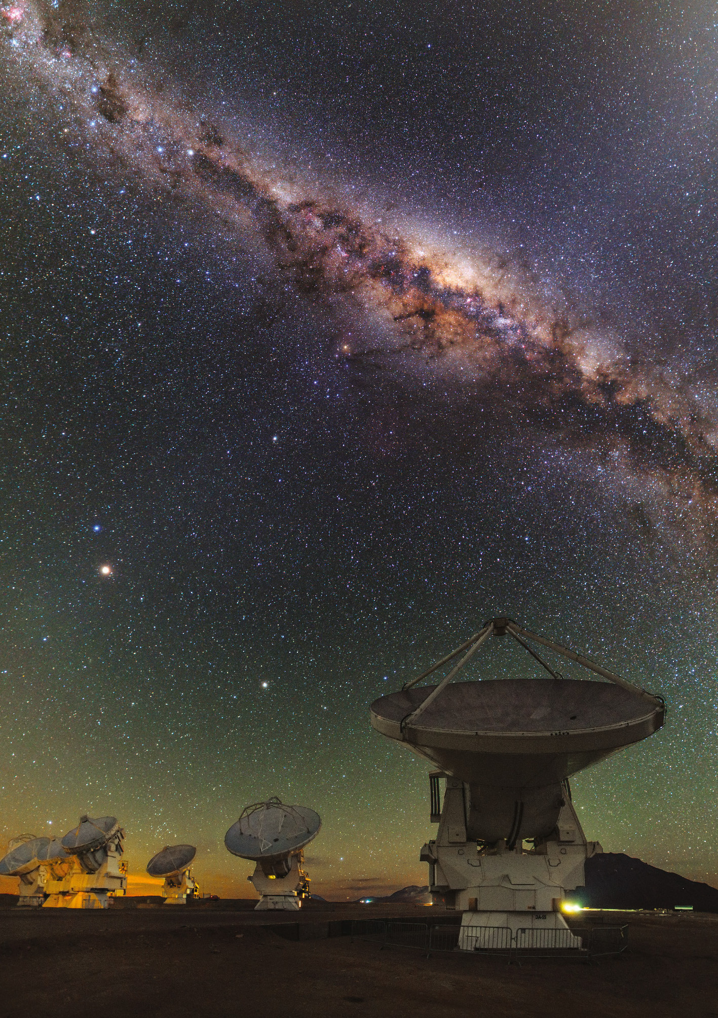The central regions of the Milky Way soar above the ALMA antennas on the Chajnantor plateau, Chile. Mars is bright in the lower left, with Saturn visible towards the centre of the image. The full resolution image used in this postcard can be viewed and downloaded here.