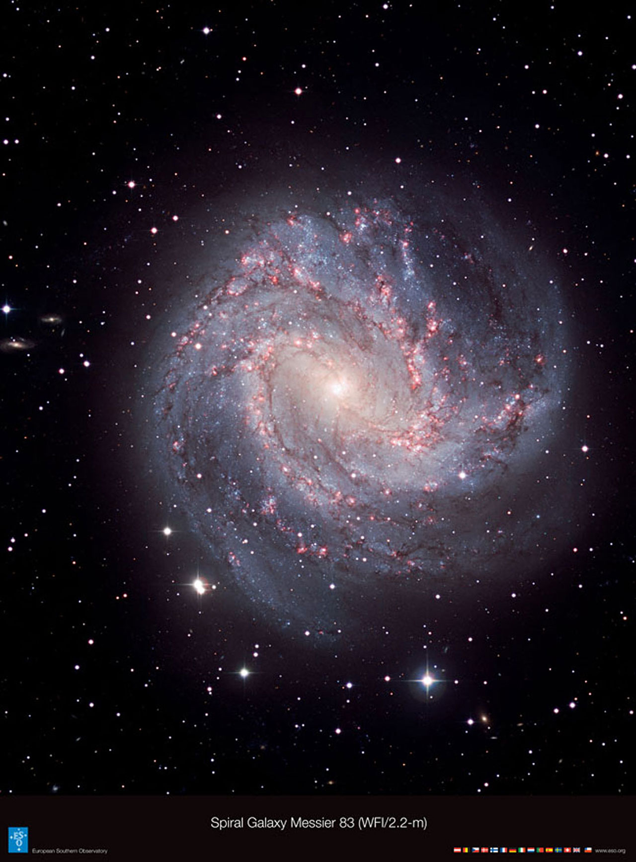 ESO's Wide Field Imager has captured the intricate swirls of the spiral galaxy Messier 83, a smaller look-alike of our own Milky Way. Shining with the light of billions of stars and the ruby red glow of hydrogen gas, it is a beautiful example of a barred spiral galaxy, whose shape has led to it being nicknamed the Southern Pinwheel.