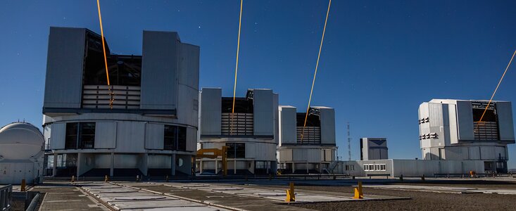 GRAVITY+ combines improvements of the GRAVITY instrument with infrastructure upgrades for the VLTI. Like its predecessor, GRAVITY+ combines the light of the VLT’s telescopes (either the 8-metre Unit Telescopes or the smaller Auxiliary Telescopes) using interferometry, but it will be assisted by upgraded adaptive optics technology that will enable better correction of the blur caused by the Earth’s atmosphere and improve the contrast of observations. GRAVITY+ will also implement one new laser guide star on each of Unit Telescopes 1-3, and will make use of one of the lasers currently installed on Unit Telescope 4, to improve the imaging sensitivity.